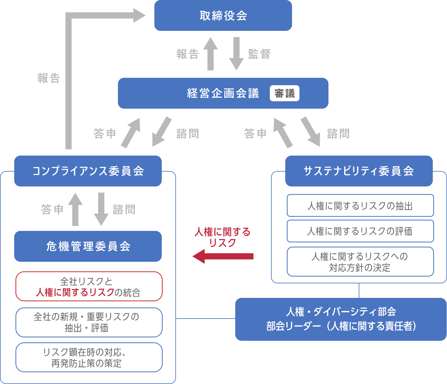 経営企画会議直轄の「サステナビリティ委員会」において、人権に関するリスクの抽出、評価並びに対応方針の決定を行っております。そこで特定されたリスクは、全社のリスクを取り扱う「コンプライアンス委員会」(経営企画会議直轄)にて、全社リスクに統合しております。これらの内容は経営企画会議に答申され、経営企画会議内にて審議されております。また、特に重要なリスクは取締役会に報告されております。