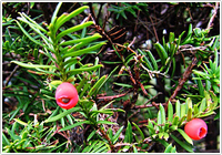 【2010年12月号】イチイはイチイ科の常緑針葉樹で庭木や生垣によく植えられて親しまれています。初秋には写真のような赤い実をつけます。この実を実際に食べてみると、ほこりっぽいですが、わずかな甘みがあります。