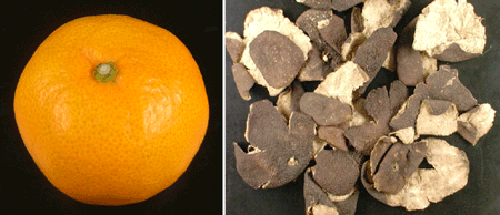 さて、鹿児島地方の農家では、食べた後のウンシュウミカンの外皮を軒先に干し、これを煎じてショウガやハチミツを加えて飲んでいたのを記憶しています。実は、このウンシュウミカンの皮を乾燥したものが「陳皮(ちんぴ)」という生薬です。中国では薬として健胃消化薬、鎮咳去痰薬とされる漢方処方に配合されています。日本では七味唐辛子の原料のひとつです。
