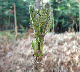 この新芽は山菜として良く食される「たらの芽」です。いろいろな食べ方があるようですがお勧めは天ぷらです。味だけでなく栄養的にも優れ、タンパク質やカリウムおよびビタミン類が多く、最近話題のポリフェノールも多く含まれています。最近では栽培品がスーパーでも入手できるようになりましたが、時期外れの真冬から売っているので季節感が薄れてしまい少し残念です。