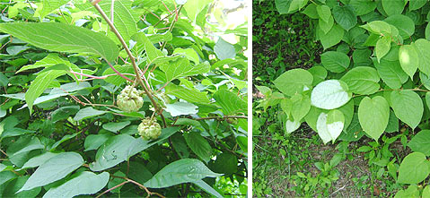 マタタビの実(虫こぶ:左)  葉が半分白くなったところ(右)