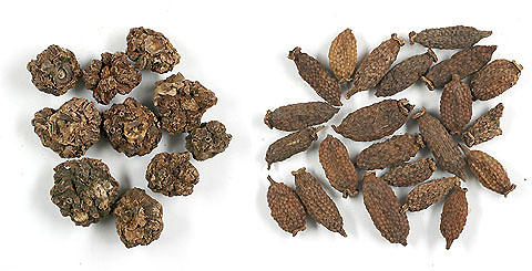 虫こぶの実の乾燥品(木天蓼:左)  虫こぶでない実の乾燥品(右)