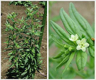 紫根は日本薬局方に収載されており、基原植物は「ムラサキ Lithospermum erythrorhizon Siebold et Zuccarini.(Boraginaceae)」と記載されています。写真1は弊社に「ムラサキ」として植えられている植物ですが、実はムラサキの代用品としてよく栽培されている「セイヨウムラサキ(L. officinale L.)」であるとの指摘を受けました。本物のムラサキは、花がもっと白くて大きいとのことです。