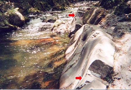 また、この横川渓谷には世界的にも珍しく、国の天然記念物にも指定されている蛇石(じゃいし)と呼ばれる岩脈があります。黒い粘板岩に変成岩の層が貫入してできた岩で、渓流に横たわる大蛇の姿に見えることから、蛇石と呼ばれているそうです。