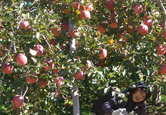 県内どこのりんごも美味しいのですが、長野県内に限れば、暖かいところ(標高の低い所)、日照時間が長い所(谷または盆地が広い所)のものが、概してより甘く美味しいようです。 「養命酒駒ヶ根工場見学→りんご狩り」は秋のお奨めコースです。是非お越し下さい。 (写真右下は謎のおばさん )