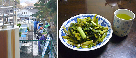 通常は収穫した野沢菜を身を切るような冷たい水で洗いますが、温泉の多い信州では、温泉の湯で洗うことも多く、温泉地ではこの時期になると専用のお菜洗い場が登場します。職場の近くにある「みのわ温泉ながたの湯」にも11月中頃から「お菜洗い場」が開設され、連日、多くの人で賑わっています。時には1時間以上も順番を待つ人がいるという超人気ぶりです。人とおしゃべりしながらお菜を洗えば、冬の寒さもいつしか忘れ、いつの間にかお肌もつるつる。一方、温泉で洗ったお菜は温泉の成分が染み込んでやわらかく仕上がり、健康にもいいとのこと。