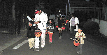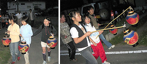 その名の通り、子供たちが提灯を手に列をつくり、リアカーに乗せた太鼓を打ち鳴らしながら地区内を練り歩きます。最後に、長い坂を登って高台に位置するお宮まで行き、お参りをして帰ります。月明かりの中、およそ2時間ほどの行程を提灯の明かりを頼りに歩きます。