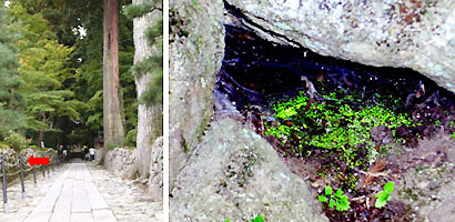 参道:矢印のあたりに光苔(左) 光苔(右)