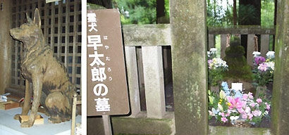 更に進み、門を抜けると右手に弁天堂(重要文化財)、正面に本尊不動明王を奉った本堂が現れます。ひとしきり拝んだ後本堂を下り、湧き水・延命水(飲料可)を横目に見つつ南に進むと、光前寺でもう1つ有名な「霊犬早太郎」のお墓があります。昔々、子女をさらう悪い怪物を退治したという霊犬早太郎。今でもその信仰は厚く、たくさんのお花が飾られていました。