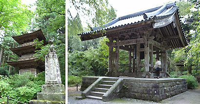 早太郎のお墓を抜け左に見えるのが、県宝・三重塔。高さ17メートル、美しい彫刻が印象的です。さらに下ると鐘楼、その隣にはしだれ桜があります。開花期間中はライトアップされ、その幻想的な姿はまさに一見の価値ありです。