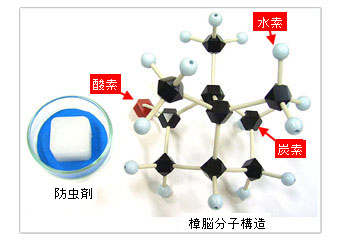 樟脳はご存知のように、防虫剤として用いられており、写真(下)のような分子構造をしています。また、かつてはセルロイドの可塑剤として大量に使用されていました。医薬品として日本薬局方にも収載されており、筋肉痛、打撲、捻挫に対し、血行の改善、消炎、鎮痛の目的で外用されています。