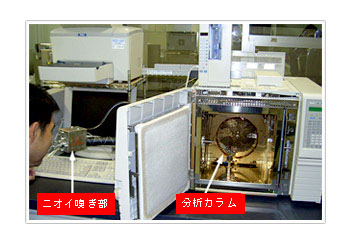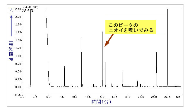 なお、このガスクロマトグラフ装置は、電気信号として検出する他に、分離された香りの成分を嗅ぐことができます。電気信号だけではどんな香りなのかわかりませんし、電気信号が大きくても、香りが強いとは限りません。そこでヒトの「鼻」をセンサーとして利用するのです。この装置を用いれば、全体の香りに強く影響している成分を見つけ出すことができます。