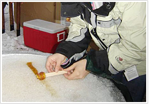 有史以来、人類が追い求めてきたもののひとつが「甘味」です。甘いフルーツや作物などを除き、最も古い甘味といわれているのはハチミツ。紀元前のものといわれる洞窟壁画などにハチミツと思しき記述が象形文字で残っているほどですが、巣を壊さずに定期的にハチミツを採る現在の養蜂技術が生まれたのは19世紀になってから。比較的新しい技術なんですね。一方、サトウキビから採取する砂糖も、紀元前2000年くらいからインドで使われていました。日本に入ってきたのは奈良時代。一説によると、鑑真によってもたらされたといわれています。この上ない貴重品であったため、当初は薬として利用されていたそうです。 サトウキビだけではなく、自然の恵みを生かした糖類は他にもあります。“サトウダイコン”としても知られる甜菜(てんさい)は、その根っこから糖分を抽出して砂糖を生成します。全世界の砂糖生産量の約3割強は、この甜菜から出来ているのです。また、砂糖椰子の樹液から砂糖(パームシュガー)を生成することもあります。 そしてサトウカエデ。カナダの国旗に描かれている、あの葉っぱの樹木です。この木の幹をうがって、ポタポタと流れ出る樹液を採取して煮詰めたものが、いわゆるメープルシロップ。100%天然のメープルシロップは多くのミネラル、ビタミンを含むだけでなく、ハチミツや上白糖よりも低カロリーということもあって最近再び注目を集めています。 メープルシロップの一大産地、カナダでは早春になると収穫祭が各地で行われます。そこでの定例イベントが、「メープルタフィーづくり」。アツアツに熱したメープルシロップを雪を上に垂らして、固まったシロップ部分に棒をあてがってくるくる回します。縁日などでも見かける「水あめ」のようにして食べるわけですが、天然の甘さと雪の冷たさが相まって、至福の味となります。小さな子どもはもちろん、大人までも楽しげに食べるカナダの春の風物詩です。 |