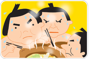 “ちゃんこ”という名前は実にかわいらしい響きですが、この由来も諸説あります。通常、ちゃんこ作りは相撲部屋の幕下力士が担当しますが、その料理番を「ちゃん」と呼んでいたためという説もあれば、中国で板金製の鍋を意味する「チャンクオ」が訛ったという説、親方のことを「ちゃん(=父ちゃん)」と呼び、弟子を「こ(子)」と呼んでいたことに端を発するという説まで、実にさまざまです。さてここで、素朴な疑問。鍋は栄養価も高く、かつヘルシーな料理のはずですが、なぜ力士は総じて太っているのか?ひとつの理由は生活習慣です。早朝から猛稽古をこなし、体がエネルギーを欲している状態でドカッと食べる。そしてすぐ昼寝。1日2食ですが、なにせ量は一般人の5〜6人分くらいともいわれるほど。しかも、デザートとしてケーキをたくさん食べてから昼寝するといったことも珍しくないそうです。 ただ、厳しい稽古の賜物で、体脂肪率はそれほど高くないところが力士たるゆえん。2005年、年間6場所完全優勝を果たした頃の朝青龍関は体重140kgほどで体脂肪率は22%だったとか。日本肥満学会によると、この「22」という数値はいわゆる標準値で、統計的にもっとも病気にかかりにくいそうです。 |