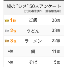 鍋の具をあらかた食べ終わったら、やっぱり“シメ”が欲しくなるもの。今回、50人に「鍋のシメに入れるものは?(重複回答可)」とアンケートをとってみました。