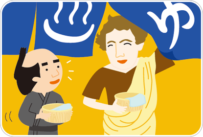驚くかな、江戸時代の湯屋は「入(い)り込み湯」と呼ばれ、男女混浴しかありませんでした。女性は薄布を巻き、男性はふんどし姿でしたが、中には妙な気を起こす輩もいたようです。幕府は風紀上の乱れから混浴禁止令を度々出しますが、長年の風習はなかなか改まらず、江戸末期にようやく今のように浴槽の中央に男女別の間仕切りをつけた銭湯が登場しました。人気漫画『テルマエ・ロマエ』でおなじみのローマ風呂も初期の頃は男女混浴だったようですが、後に時間帯を分けて男女別に入浴していたといわれています。ローマでも江戸でも、公衆浴場は社交場の役割も果たしていたので、今よりずっとオープンだったのかもしれませんね。