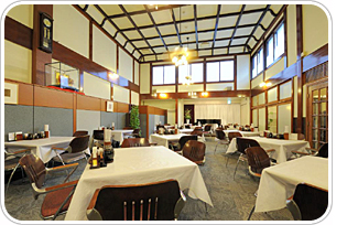 | レストランホールの見事な格天井(ごうてんじょう)に、その名残を見ることができます。 | |