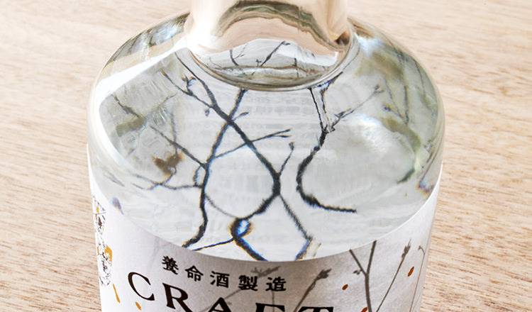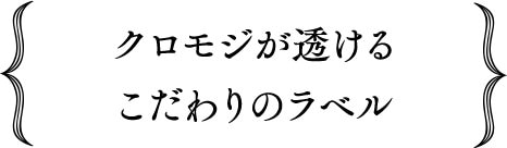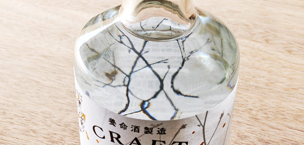 ボトル正面から透かしのように見えるよう、ラベル内側にクロモジのデザインを施しています。また、ボトル内で光が屈折することにより、上部から見ると、ボトルの内側に木漏れ日のような揺らぎを感じることができます。
