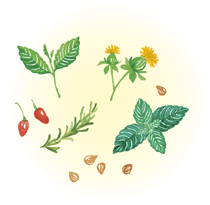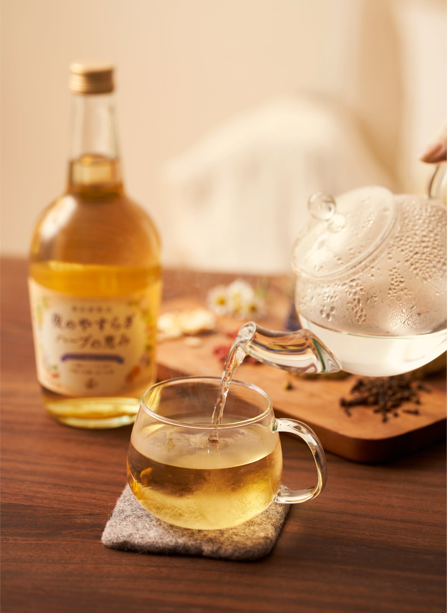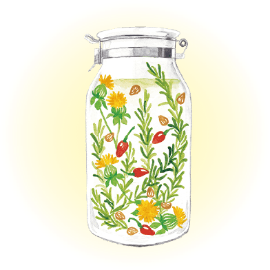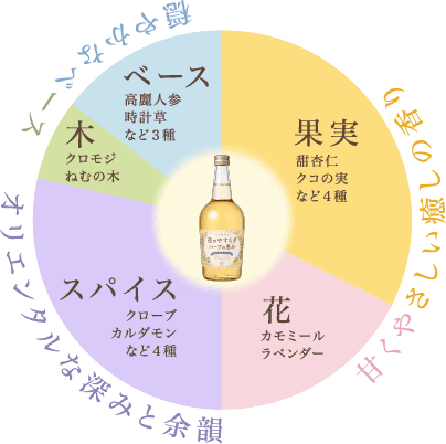 複数のハーブをまとめてお酒に漬け込み、素材本来の風味と成分を引き出す合醸法。