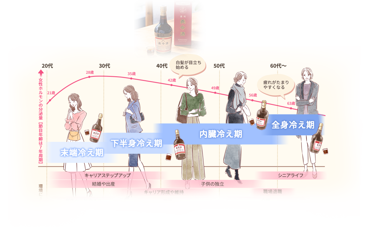 しかし、一言で「冷え」といっても、その原因は様々。また冷えは、ライフスタイルや加齢による体の変化に伴って、冷えの原因や冷える部位も異なることが多いため、年齢にあわせた対策が必要です。