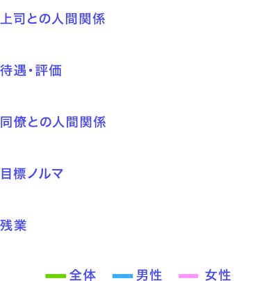 最も多く挙がったのが「上司との人間関係」さらに、「同僚との人間関係」は男女で差が見られ、女性の方が同僚との関係がストレスの原因になっている結果に。