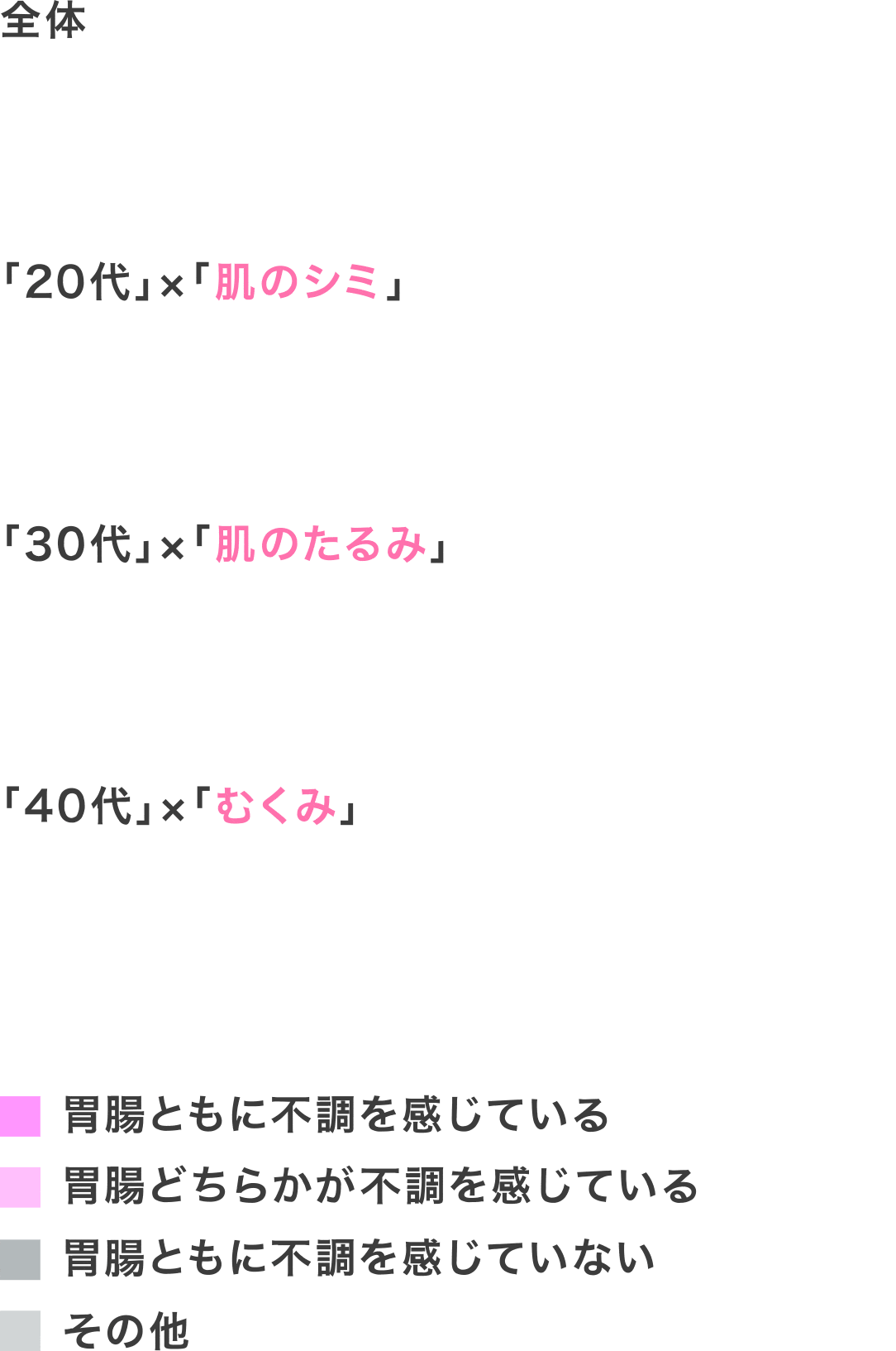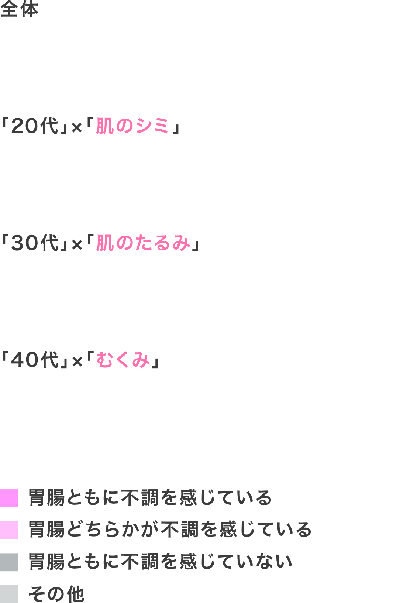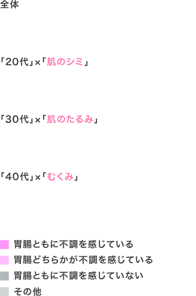 全回答者1,000 名に、最近、感じている美容の悩みを選んでもらい、胃腸の調子との関係性をみると、胃腸の不調を「感じている」と回答したのは、20 代で美容の悩みが「肌のシミ」の女性では78.9%、30 代で美容の悩みが「肌のたるみ」の女性では75.7%、40 代で美容の悩みが「むくみ」の女性では75.0%となり、美容の悩みと胃腸不調との因果関係を感じさせる結果となりました。