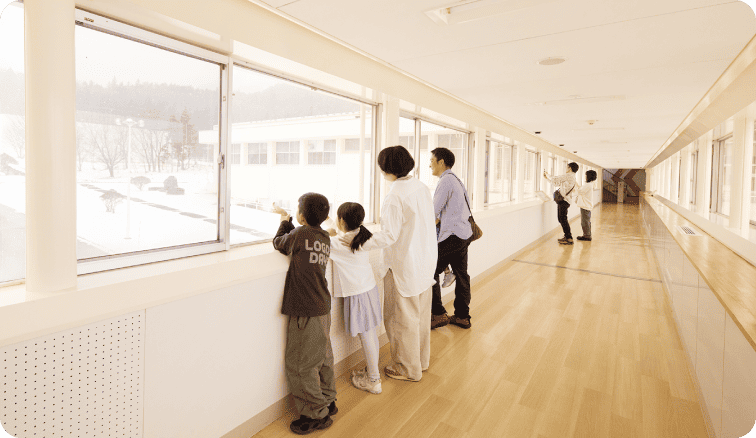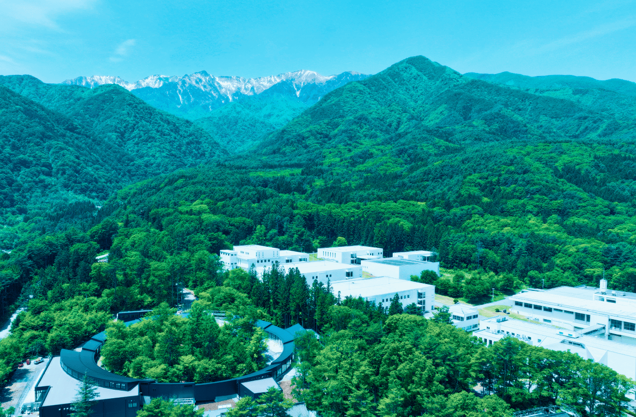 養命酒の造り方ゾーンとファクトリーゾーンをつなぐ渡り廊下は、駒ヶ根工場の全景と、アルプスの山々をパノラマで見渡せる絶好のビューポイント。