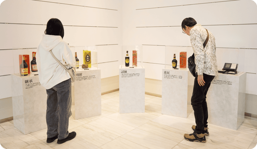 • 会社創立から、100年余りの歩みをご覧いただける「歴史展示」。ラベルやビンの形状の変化にもご注目。