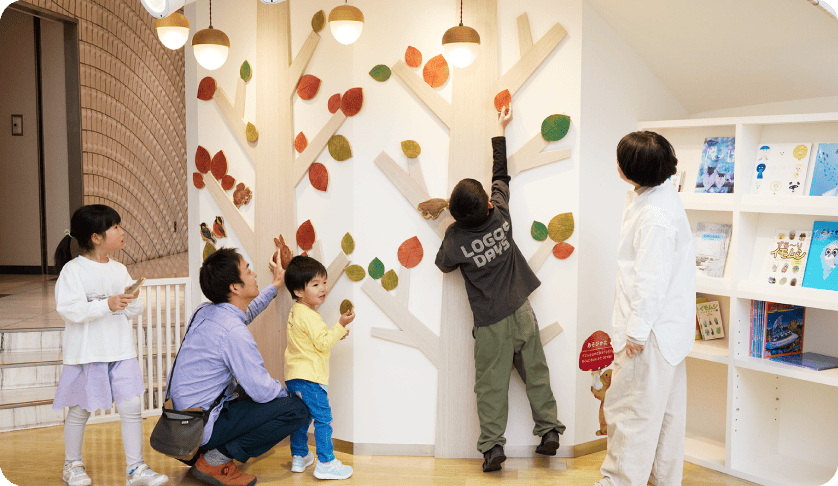 • 絵本や動植物のマグネットで遊べる「キッズプレイウォール」。どんぐり型のライトがとってもキュート。