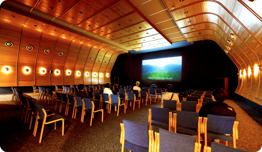 • 駒ヶ根の雄大な自然をめぐる、迫力ある映像を上映中。木の壁材や、曲線の多い形状など、落ち着く雰囲気の映画ホールです。