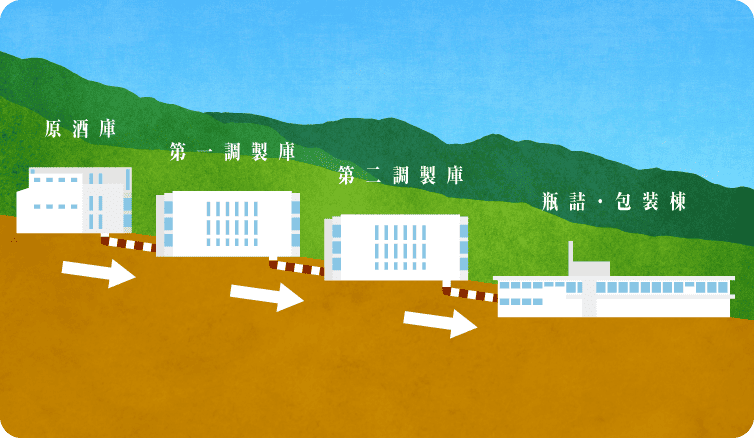 工場の建物はすべて斜面の上に建てられており、液体が上から下に流れてくるように設計されています。景観や環境に配慮し、自然の力を生かした造りになっているのです。