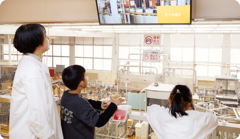 • 解説映像が流れるモニターをご用意。ボタンに手をかざすと生産ラインがストップしている日でも、稼働中の様子を見ることができます。