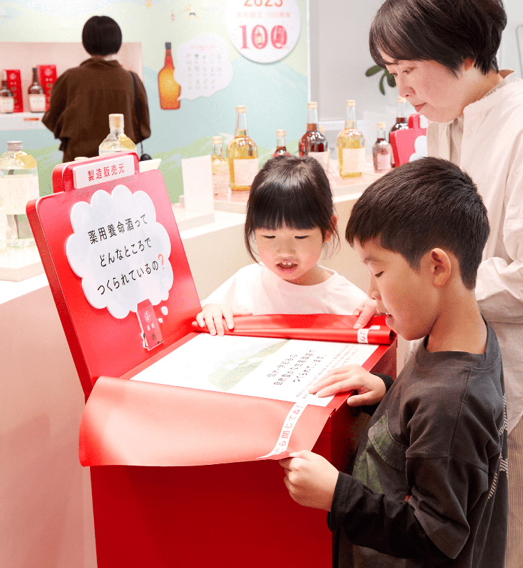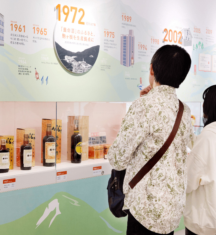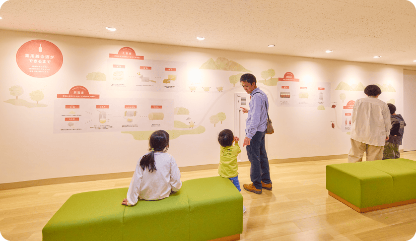 • ビン詰めから出荷まで、養命酒ができるまでの一連の流れを、壁面のイラストでわかりやすく紹介しています。