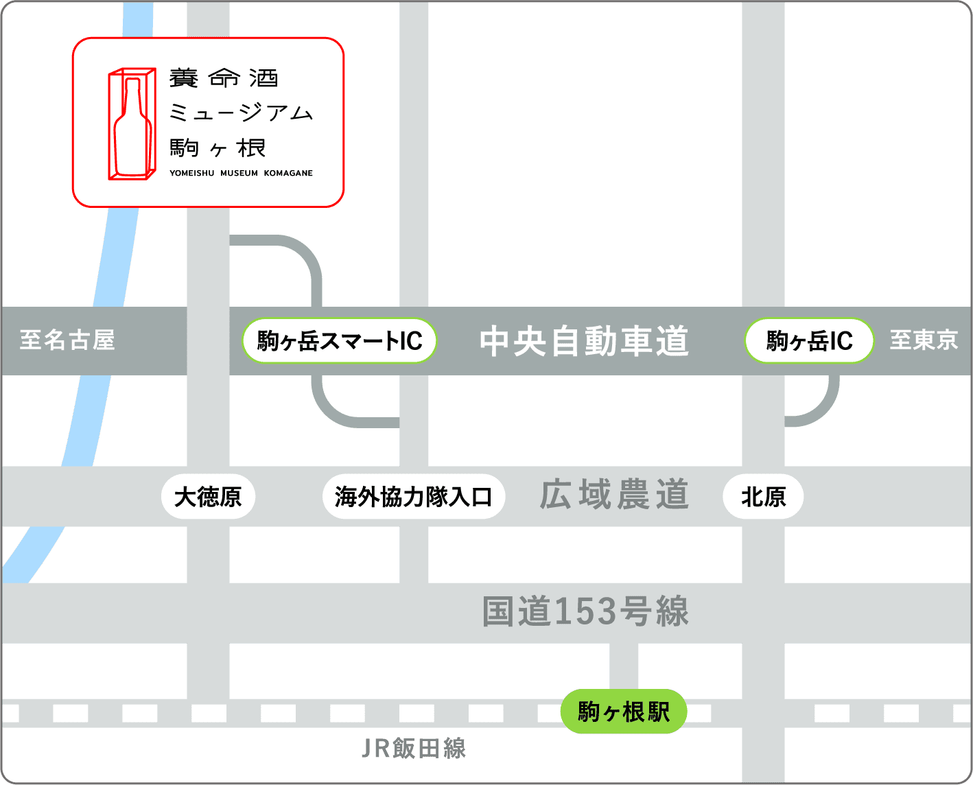 養命酒 ミュージアム 駒ヶ根 YOMEISHU MUSEUM KOMAGANE 至名古屋 駒ヶ岳スマートIC 中央自動車道 駒ヶ岳IC 至東京 大徳原 海外協力隊入口 広域農道 北原 国道153号線 駒ヶ根駅 JR飯田線