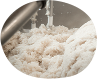 原酒に用いる「みりん」は、蒸したもち米に麹(こうじ)を加え、一定期間熟成させて造ります。もち米が麹の作用によって糖化して、甘くまろやかな「みりん」になります。