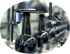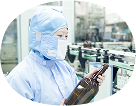 調整後の「養命酒」はびん詰め室へ送られ、厳重な衛生管理の下、びん詰めされます。