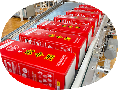 びん詰め後、包装室に送られて、ラベルを貼付し、ケースに収めて完成品となります。そして、この工場から、みなさまの元へ届けられるのです。