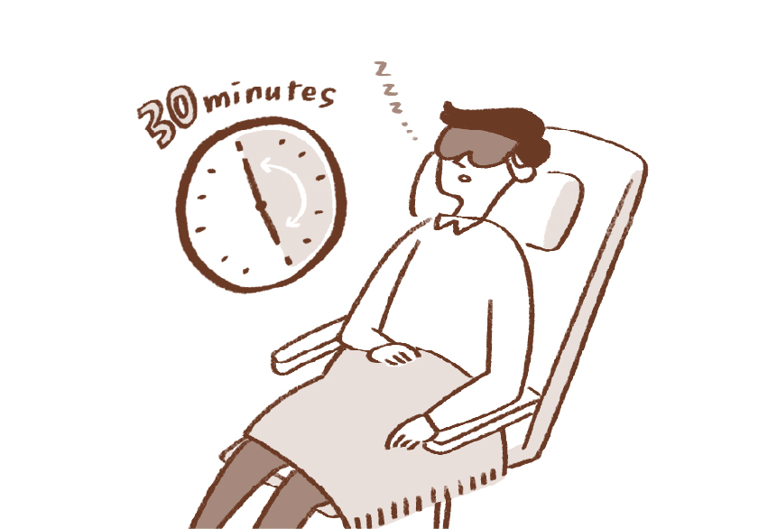 夜に質のよい睡眠がとれない時は、昼寝を活用して気をチャージしましょう。ただし、夜の睡眠に影響がないよう30分程度がおすすめ。気分のリフレッシュや、その後の集中力アップにも効果的です。 -