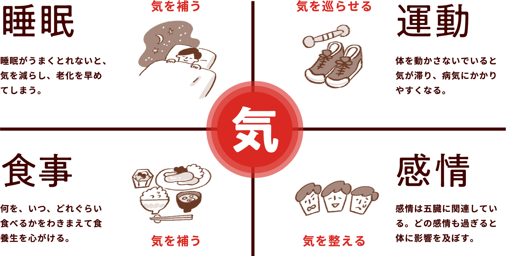 「変」への調整力を維持し、さらには高めていくことが養生のポイントです。そのカギを握るのは「気」です。気を整えるために毎日の生活で心がけたいのが、「睡眠」「運動」「食事」「感情」です。