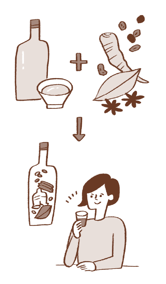 生薬はお酒に漬けることで、有効成分が速やかに吸収され、効率よく体を巡ります。この「生薬+お酒」の効果を利用したのが「薬酒」です。生薬の中には熱に弱いものもありますが、それらはお酒に漬けることでその薬効が抽出でき、お酒の力によって味わい深く、飲みやすくすることができます。また、お酒は感情を和らげ、リラックスする効果が期待できることもあり、これも薬酒の利点といえるでしょう。薬酒を生活の中に取り入れることは、日々の養生にプラスの効果をもたらします。 -
