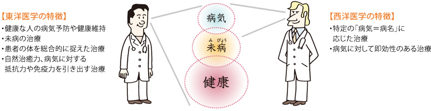 未病や不定愁訴の状態では、循環器、呼吸器、消化器など人間の体を細分化して捉える西洋医学の治療の対象になりにくいこともあります。一方、東洋医学では、患者一人ひとりの体質や体全体の状態を総合的に捉えていき、体全体のバランスを整える治療をします。